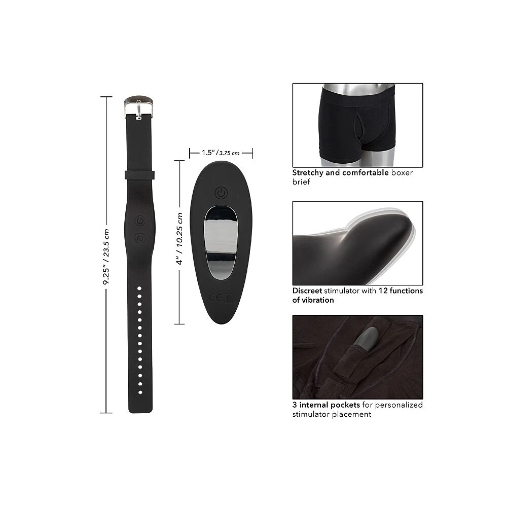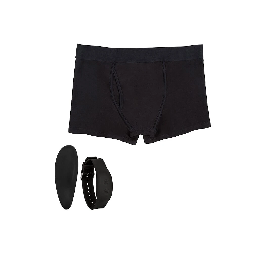 Un boxer très confortable associé à un petit vibromasseur contrôler par une télécommande sous forme de bracelet.