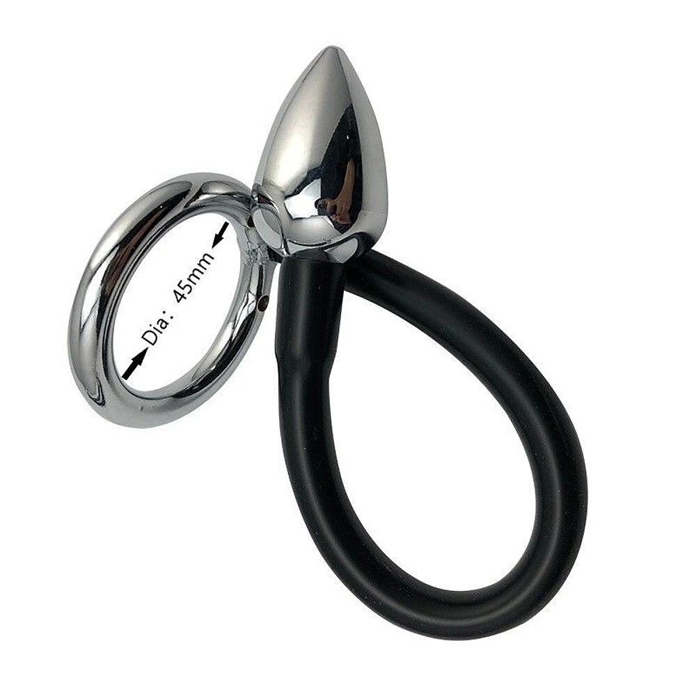 Un cockring en acier inoxydable doté d’un plug anal lisse et d’un anneau en silicone.