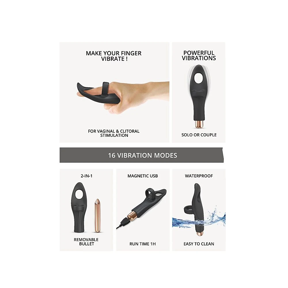Glissez votre doigt dans l’anneau, choisissez l’un des 16 modes de vibration et profitez un maximum ! A utiliser en solo dans le lit, ou en vous isolant dès que vous avez un coup de chaud… Ou à deux ! Un petit sextoy ultra discret qui s’invite parfaitement dans les jeux du couple, pour glisser sur tous les corps, en particulier sur le clitoris,