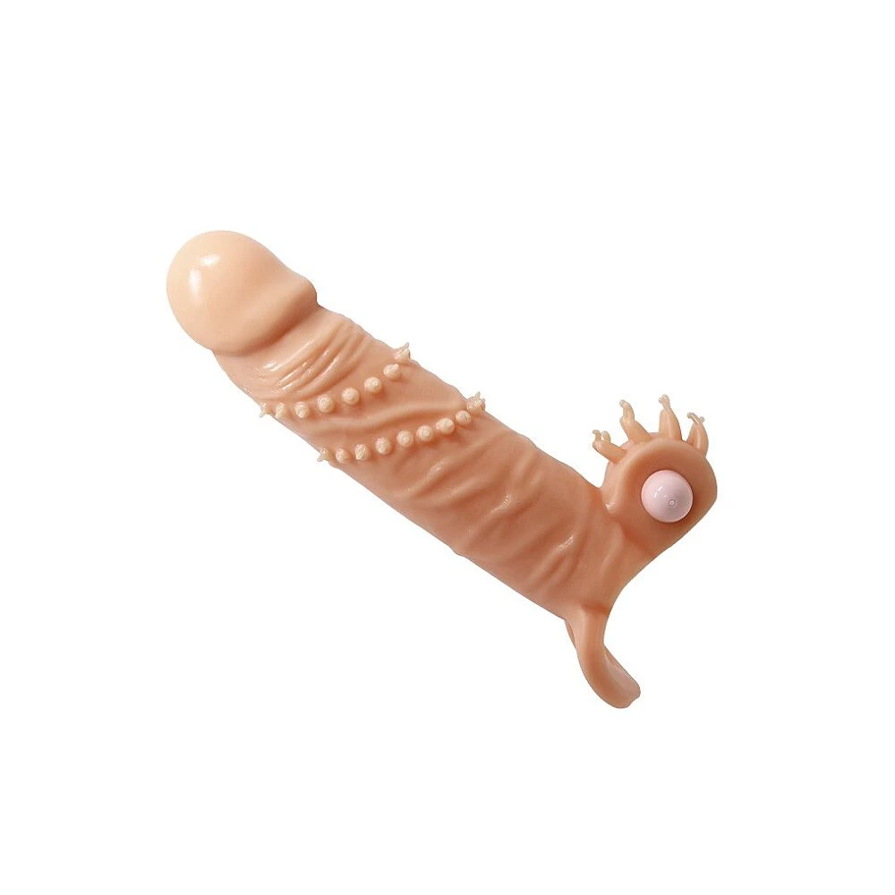 Cette gaine à pénis présente un aspect réaliste et est maintenue en place grâce à un anneau flexible.
