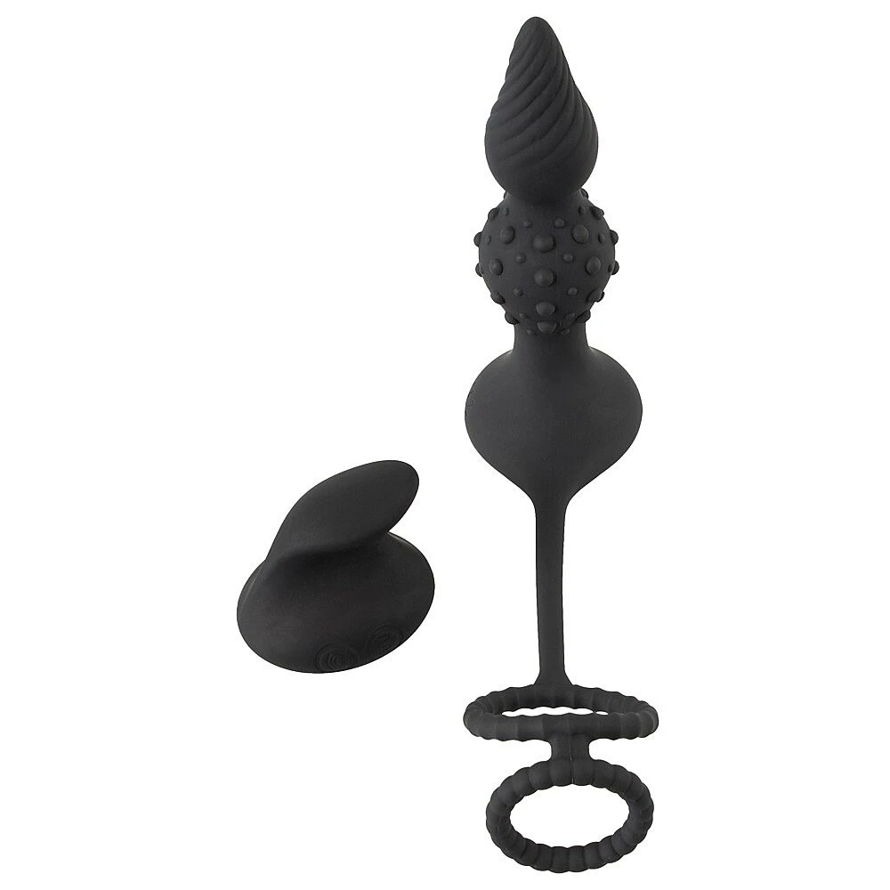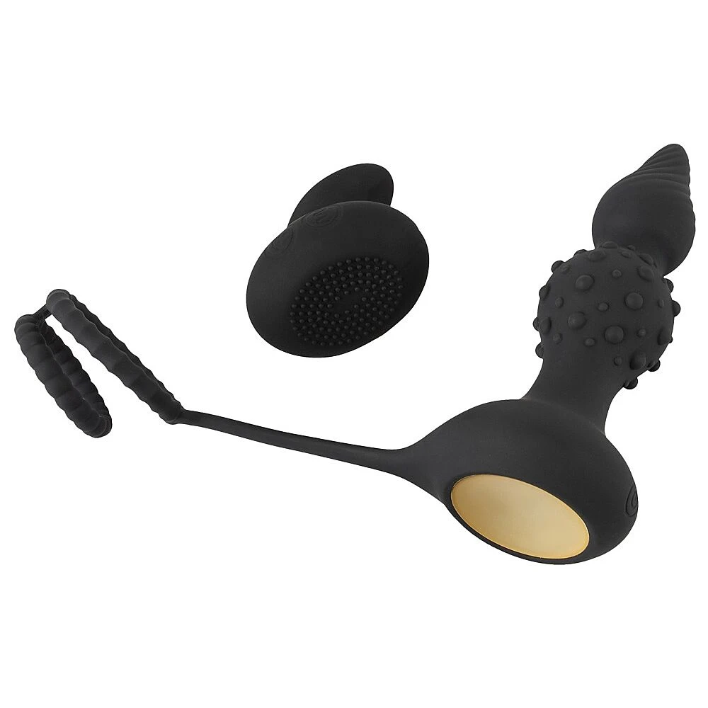 Ce sextoy de la marque Rebel combine un plug anal vibrant avec un cockring et un second anneau pour testicules.